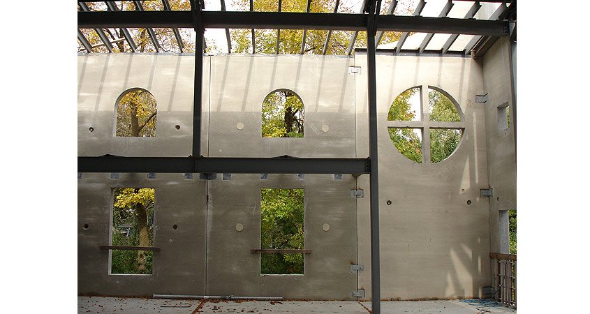 The church sits on long, narrow lot in a western suburb of Chicago, Village of Bensenville. The existing church was a simple, unadorned structure situated on a nondescript site surrounded by small houses. The architect’s first task was to rethink the relationship between the existing buildings and a new addition. The congregation’s list of needs was formidable: a minimum of 7600 sq.ft. had to fit to enable its membership to grow, a flexible space to accommodate numerous programmatic elements was necessary and the church leaders wanted the new sanctuary to have a high cathedral ceiling, with mezzanines and balconies flanking both sides.